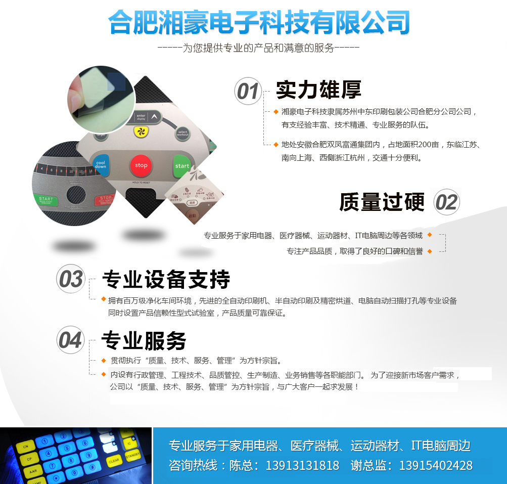 公司簡介 合肥湘豪電子科技有限公司系香港中意國際集團股份有限公司(1998年創(chuàng)建)下屬企業(yè),關(guān)系企業(yè)有:東莞中意塑膠制品有限公司(1996年創(chuàng)建),蘇州中意塑膠制品有限公司(2003年創(chuàng)建),蘇州中東包裝印刷有限公司(2007創(chuàng)建),蘇州捷瑞達自動化科技有限公司(2014年創(chuàng)建),東莞唯道實業(yè)有限公司(2014年創(chuàng)建),合肥六九機器人自動化科技有限公司(2015年創(chuàng)建);合作企業(yè)有:香港富通工業(yè)集團。 公司總部設在經(jīng)濟發(fā)達的香港,總公司這十幾年來先后在東莞,蘇州投資設廠,為滿足合肥市場廣大客戶的需求,總公司于2015年與香港富通工業(yè)集團合作在合肥投資設廠,打造電器控制面板,薄膜開關(guān)業(yè)界的航空母艦,創(chuàng)造專業(yè)產(chǎn)品,樹立精品觀念,鍛造高品質(zhì)、高服務的企業(yè)形象,樹立正確的核心價值觀。全心全意為國內(nèi)外品牌企業(yè)服...榮譽資質(zhì)